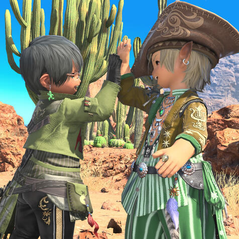 Cactuar Cantina is a joint business venture started up by Ruckus Fiddlesticks & Pakeke Pake. Their fast-forged friendship was formed when Ruckus became a “regular-regular” of the Desert’s Refuge and invited Pakeke to attend his lectures at Honesis Institute on poetry and Lalafellin linguistics. Since then, they’ve become loyally mutual patrons, oft seen at each other’s workplaces and known to barhop Eorzean venues as a dynamic duo. Upon acquiring land, it seemed a sensible stroke of fate to join forces and welcome friends old and yet unfound to a laid-back, shared place to brush the sand off their spurs and catch the latest Thanalan gossip.
